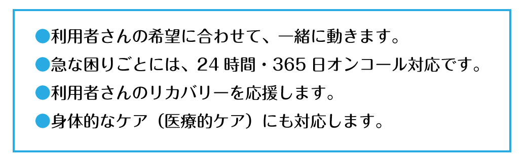 訪問看護は、ご自宅でサービスを提供します。病気の回復や自立のために必要な活動などについては担当のスタッフにご相談して下さい。その際、訪問看護以外のサービスに該当する場合は、そちらのサービスが優先されます。